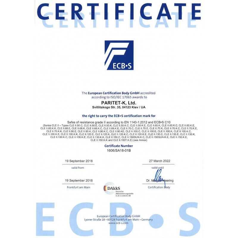 Огневзломостойкие сейфы TM Griffon серии CLE II сертифицированы Европейским органом сертификации ECB-S по II класса сопротивления к взлому по EN 1143-1, имеют защитный слой корпуса и двери - фортификационный взломостойкий бетон толщиной 55 мм. Соответствуют классу огнестойкости LFS 30P по ДСТУ EN 15659. Ключевые особенности сейфов серии CLE II Cream - оригинальный кремовый цвет покраски, наполнение их стенок фортификационным бетоном, что позволяет во много раз увеличить степень безопасности и повысить уровень защищенности от возможного взлома и трехсторонняя система запирания. Сейфы серии CLE II комплектуются сертифицированными сейфовыми замками – STUV или M-LOCKS и немецкой термолентой BASF.Тип сейфа огневзломостойкий Внешние размеры, мм (В/Ш/Г) 506 мм/460 мм/480 мм Внутренние размеры, мм (В/Ш/Г) 390 мм/350 мм/312 мм Масса, кг 210 Объем, л 43 Толщина защитного слоя, мм 55 Взломостойкость II класс по EN 1143-1 Огнестойкость класс LFS 30P по ДСТУ EN 15659 Система запирания ригельная система трехстороннего действия (5 хромированных активных вращающихся ригеля, диаметр ригеля 25 мм., антисрезы со стороны петель) Тип замка электронный кодовый сейфовый M-LOCKS (Нидерланды), сертификат класса VDS 2 Тип покрытия лако-красочное покрытие Цвет кремовый Полки 1 Дополнения анкерные узлы для крепления сейфа к полу; термолента BASF. Гарантия на конструкцию 5 лет Гарантия на замок 1 год
