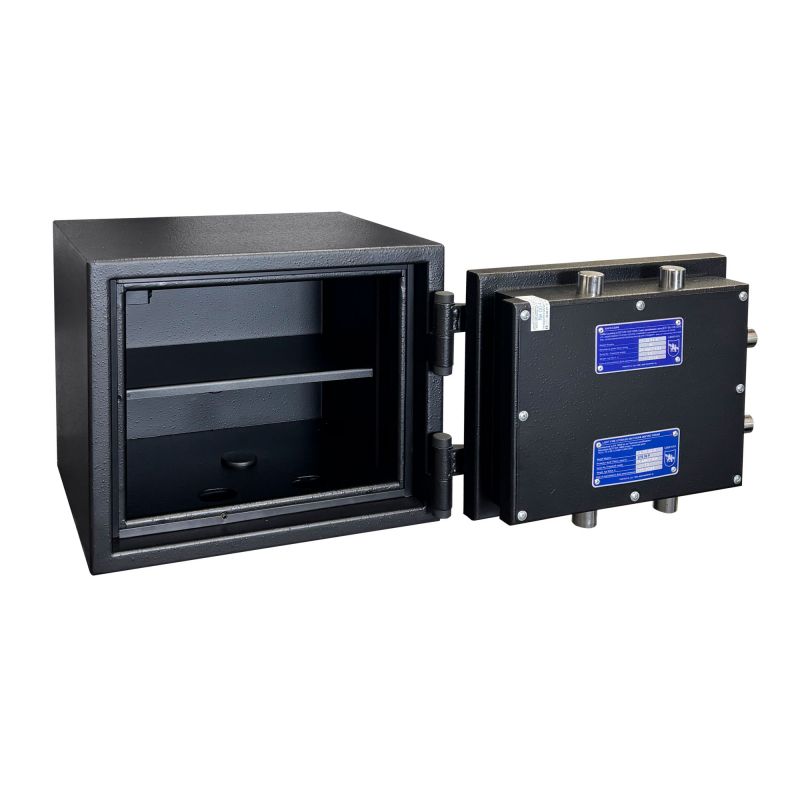 Сейф CL III.32.K Black комплектується сертифікованим сейфовим ключовим замком WITTKOPP (Німеччина), сертифікат класу VDS 1. Наявна антизламна система переблокування замків.