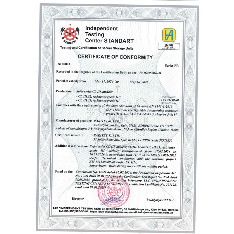 Сейф CL III.32.K Black сертифіковано відповідно до третього класу безпеки згідно з ДСТУ EN 1143-1. Відповідає класу вогнестійкості LFS 30P за ДСТУ EN 15659, що гарантує збереження документів та цінностей від дії високих температур протягом 30 хвилин.